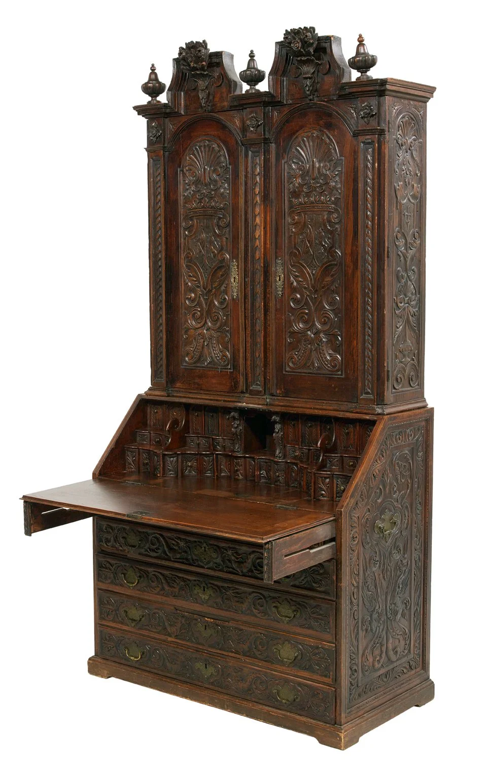 Antique wooden secretary desk with intricate carvings and multiple drawers on white background.