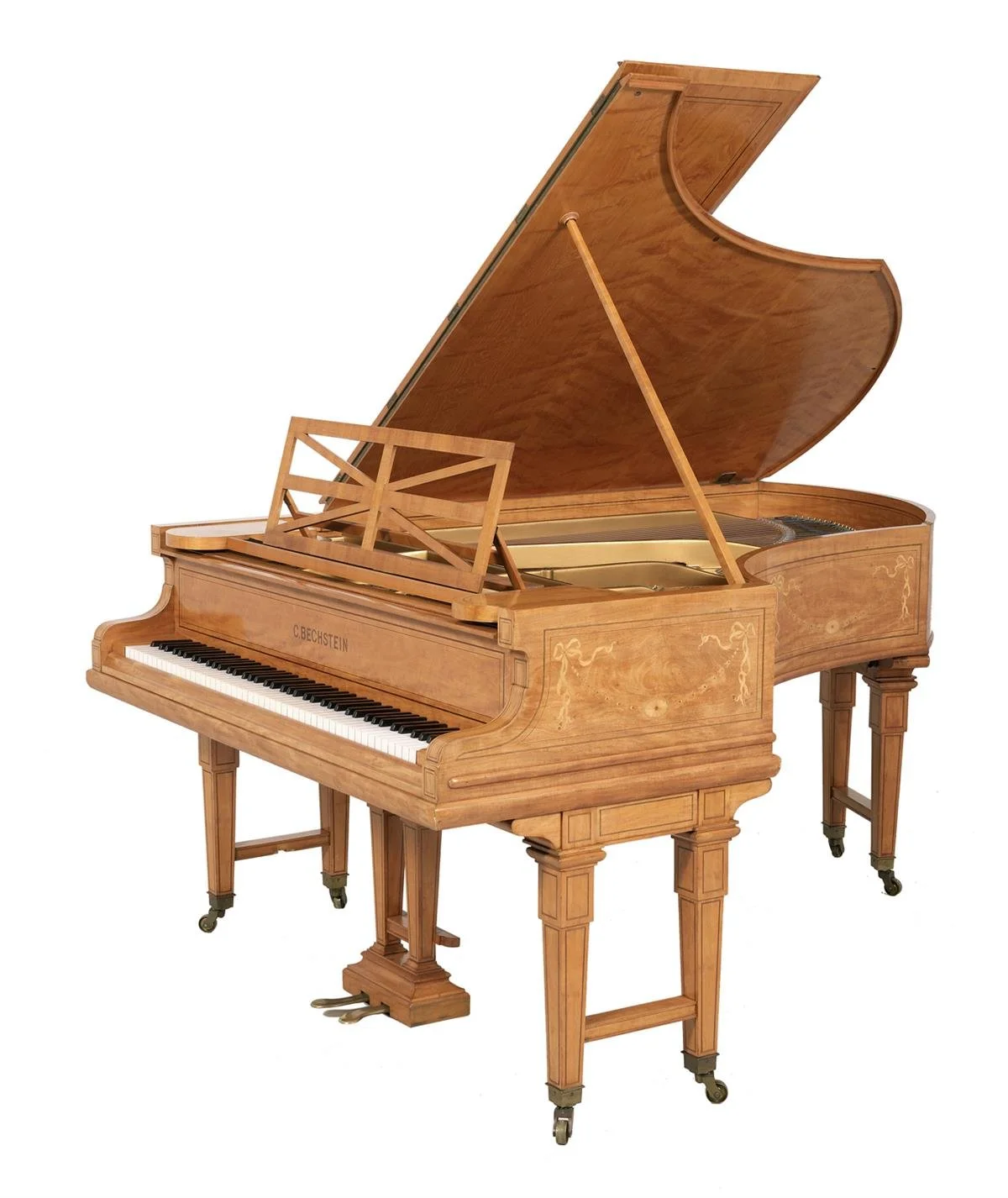 Wooden grand piano with open lid and ornate design on legs and body on white background.