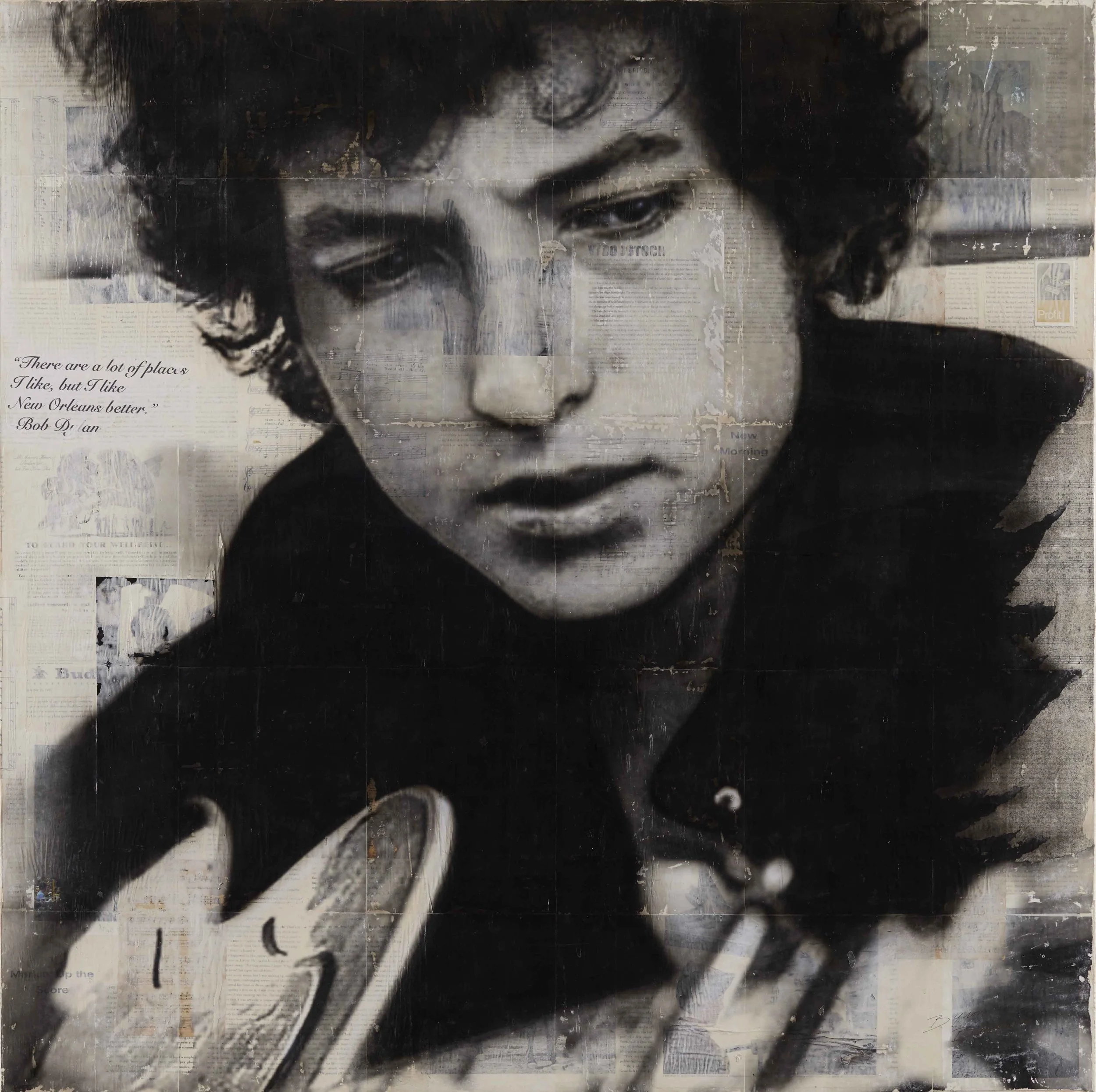 Black and white artwork of Bob Dylan holding a guitar and looking down. There is a quote on the side discussing a preference for New Orleans.