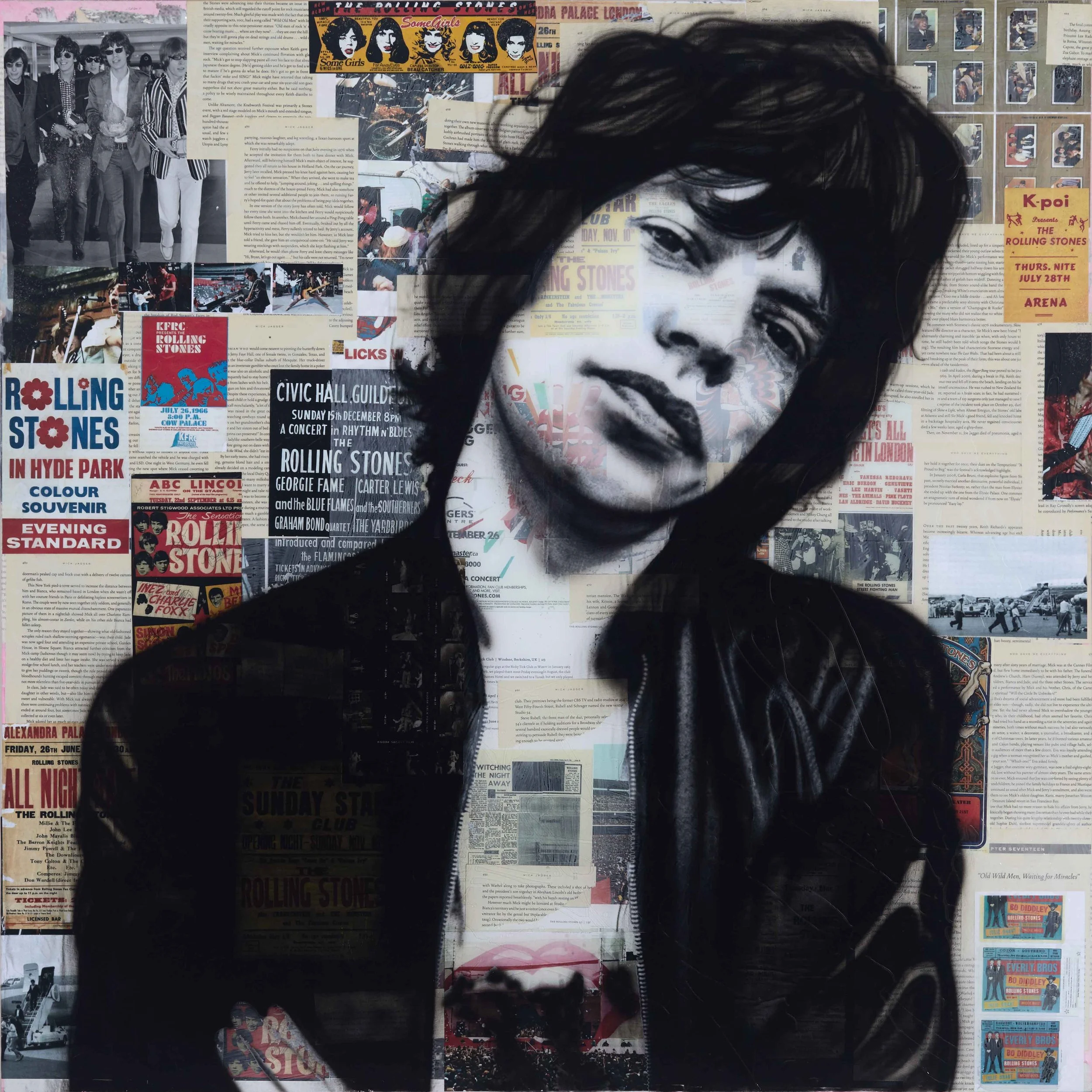 Black and white portrait of Mick Jagger against a collage of Rolling Stones memorabilia, including posters and newspaper clippings.