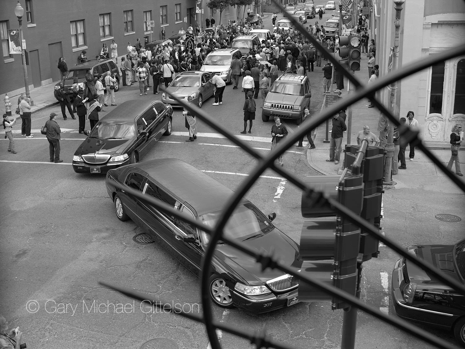 Black and white photo of a crowded street intersection with several cars and limousines, surrounded by a large crowd of people. The foreground has a blurred railing, indicating the photo was taken from above. Jazz Funeral.