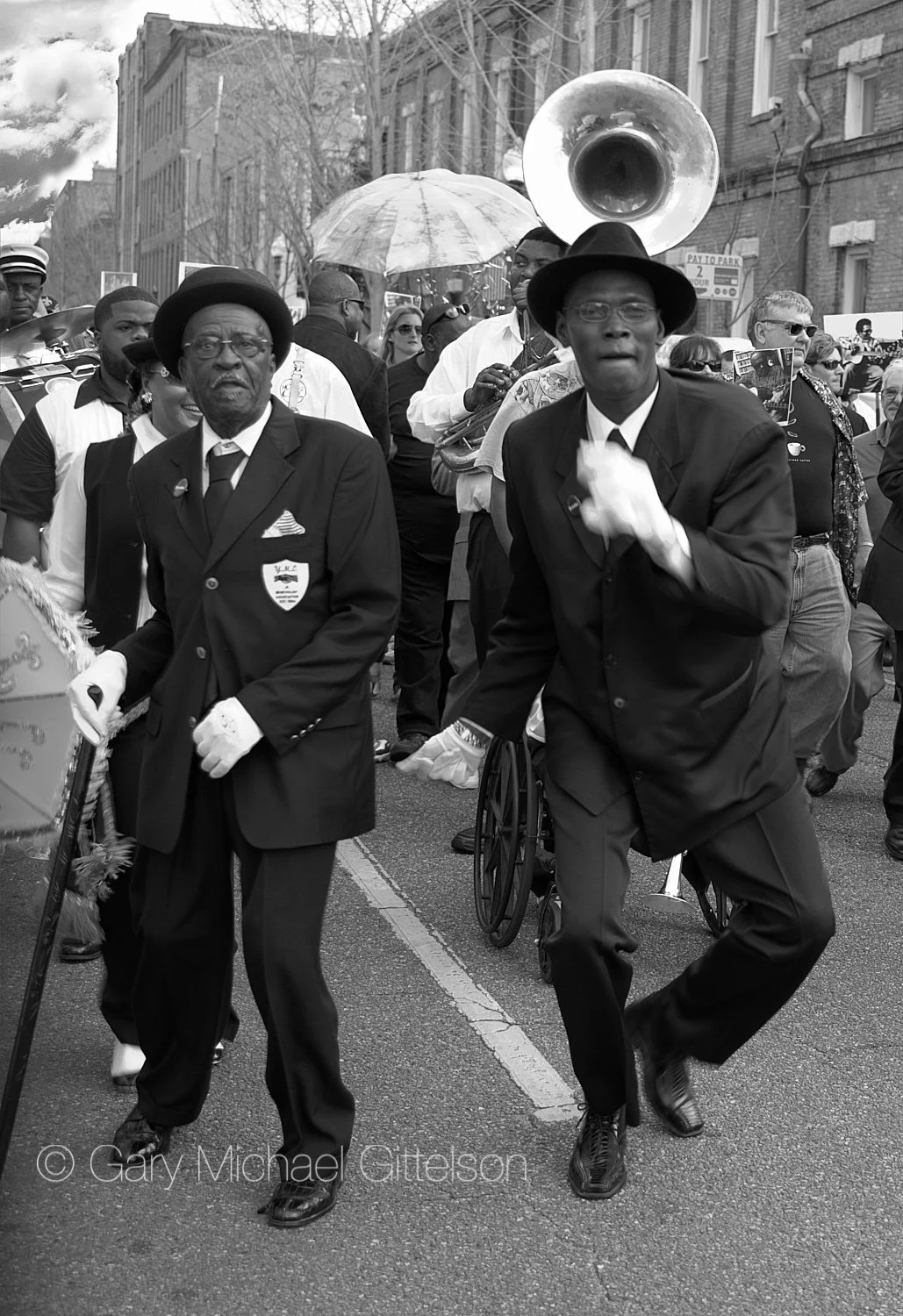 Black and white photo of two men in suits and hats dancing in a street parade, accompanied by musicians playing brass instruments. The atmosphere is lively with participants marching and performing. Jazz Funeral.