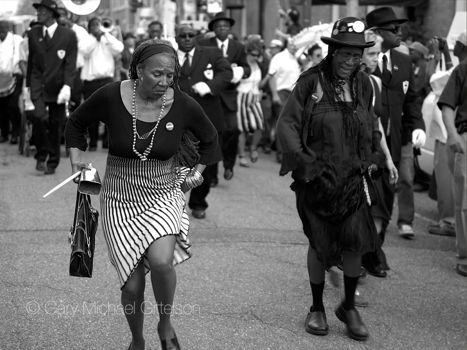 A black and white image of two women energetically dancing in a second line, followed by a procession of people in formal attire, including musicians with brass instruments. Jazz Funeral.