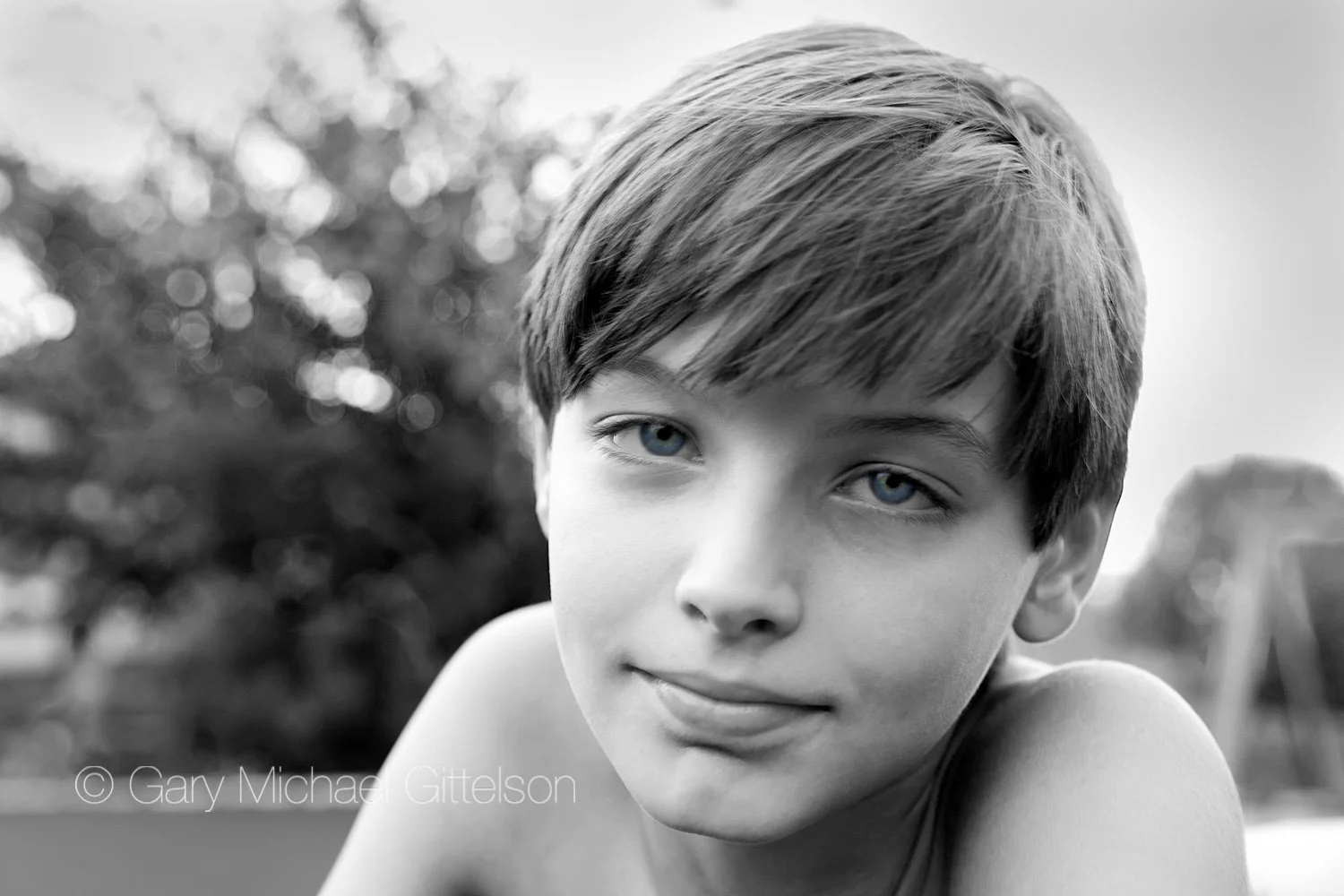 A close-up black and white photo of a young boy with blue eyes, smiling slightly, with an outdoor background.